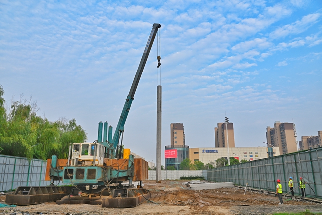 走進(jìn)宿蘇外南北校區(qū)施工現(xiàn)場,映入眼簾的是一片繁忙景象,不僅有忙碌的工人,還有火力全開的機械設(shè)備。大型機械臂吊將一根根混凝土方樁移送到樁機上,大型樁機猶如鋼鐵堡壘般高高屹立,從早上6點到晚上10點,壓力器不停地將混凝土方樁“打”入20多米深的地下,本項目總約300根樁,主要采用靜壓法沉樁工藝,樁體平均長度21米,每根樁施工約1小時。