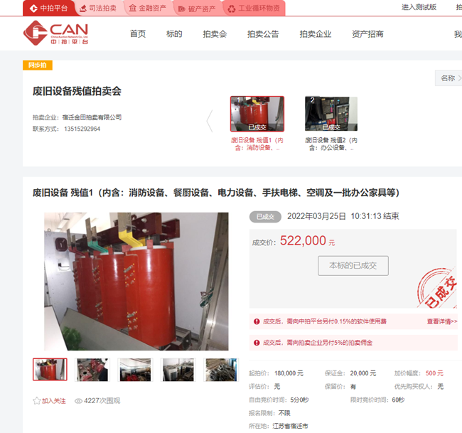 3月25日上午10時,城發(fā)公司一批廢舊消防設(shè)備、餐廚設(shè)備、電力設(shè)備、手扶電梯、空調(diào)等物資在中拍平臺公開拍賣,經(jīng)過30分鐘的緊張激烈競價,最終以522000元成交標的,比評估價180000元高出342000元,溢價率190%。