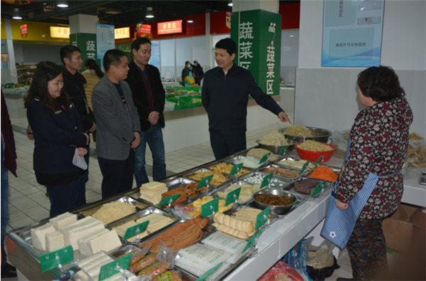 戈亮一行現(xiàn)場聽取了菜場負責人開業(yè)準備工作情況匯報,實地察看了生鮮菜場規(guī)劃布局、開業(yè)方案、食品安全臺賬、食品安全檢測室設備,與各經(jīng)營戶親切交談。