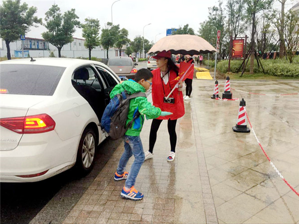 10月21日上午,第一組家長志愿者首次上崗,他們在雨中指揮車輛、疏導(dǎo)交通,用實(shí)際行動(dòng)為孩子們撐起了一把“愛心保護(hù)傘”。